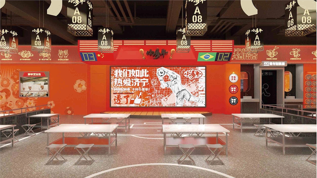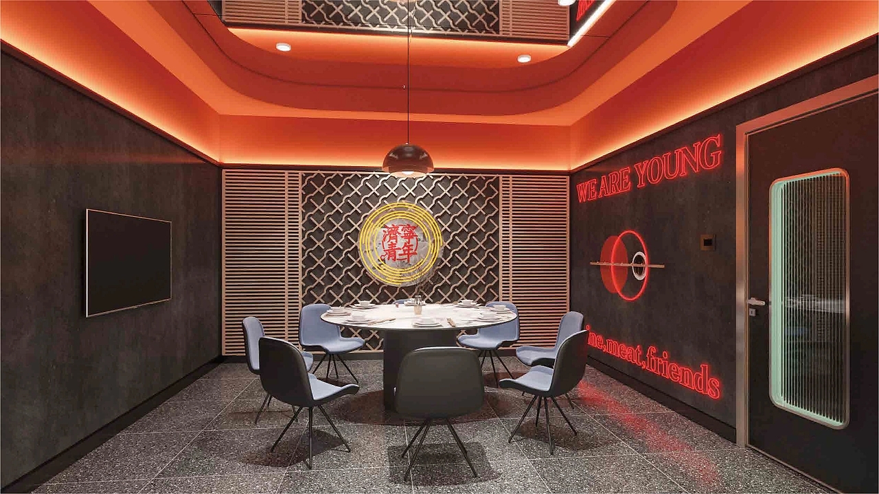 餐厅空间设计是品牌理念落地的关键,“小青年城市会客厅” 彻底打破传统餐厅 “餐台罗列” 的刻板布局,以 “社交场景优先” 为原则,打造富有故事感的独立会客空间。走进门店,看不到孤立的餐桌,取而代之的是围绕 “以串会友,以酒会友” 构建的多元社交模块:有适合三五好友围坐畅谈的 “热血卡座”,桌面嵌入可书写的涂鸦板,青年可随手记录灵感或心情;有适合多人派对的 “拼搏长桌区”,头顶悬挂着由青年运动装备、手写信件组成的装置艺术,传递 “并肩奋斗” 的氛围;还有半开放式的 “探索话题角”,墙面设置 “青年心愿墙”,消费者可贴上便签分享梦想,也可参与每周更新的主题讨论 —— 从 “职场新人如何快速成长” 到 “小众爱好如何坚持”,让社交不再局限于熟人圈子。空间细节更暗藏巧思:灯光采用可调节的暖黄色调,营造轻松氛围;背景音乐精选青春励志的流行曲与校园民谣,唤醒共同记忆;甚至服务员的工装也印着 “保持热爱,奔赴山海” 等青年向标语,让整个空间都成为 “青年意志的安放地”,在品尝烧烤的烟火气中,自然创造聚会、交流的机会,让 “青年会客” 的品牌概念深入人心。