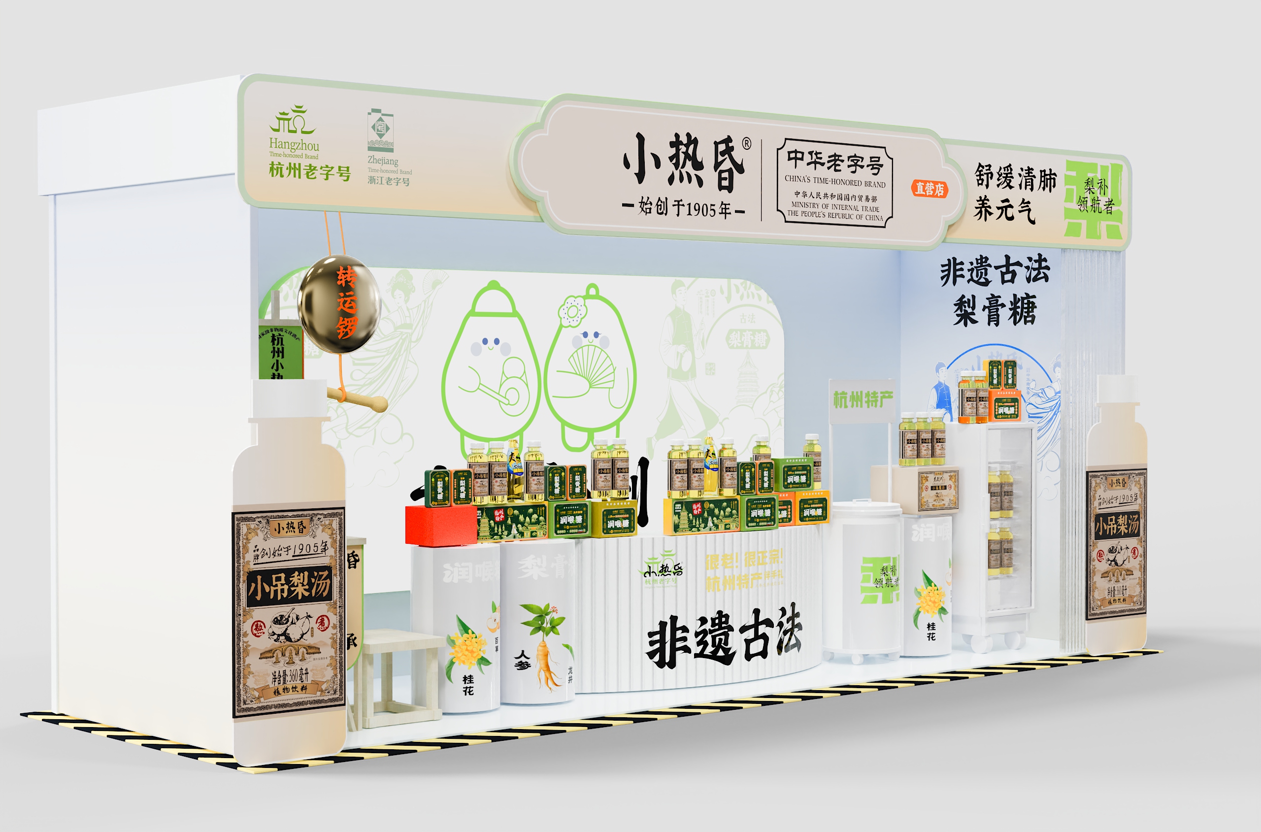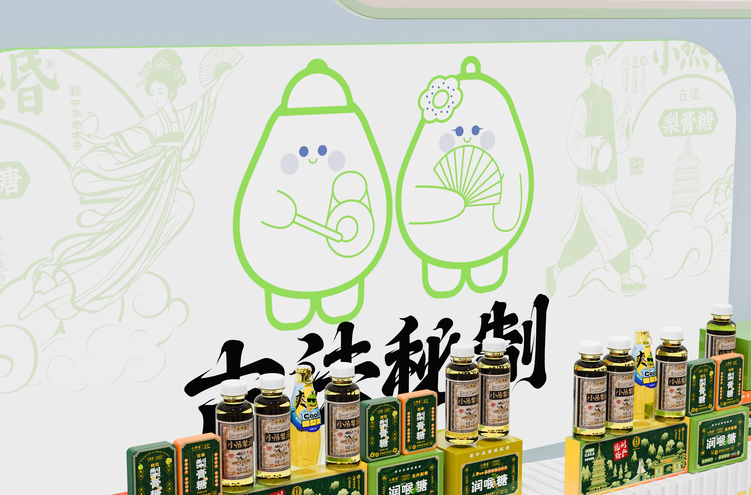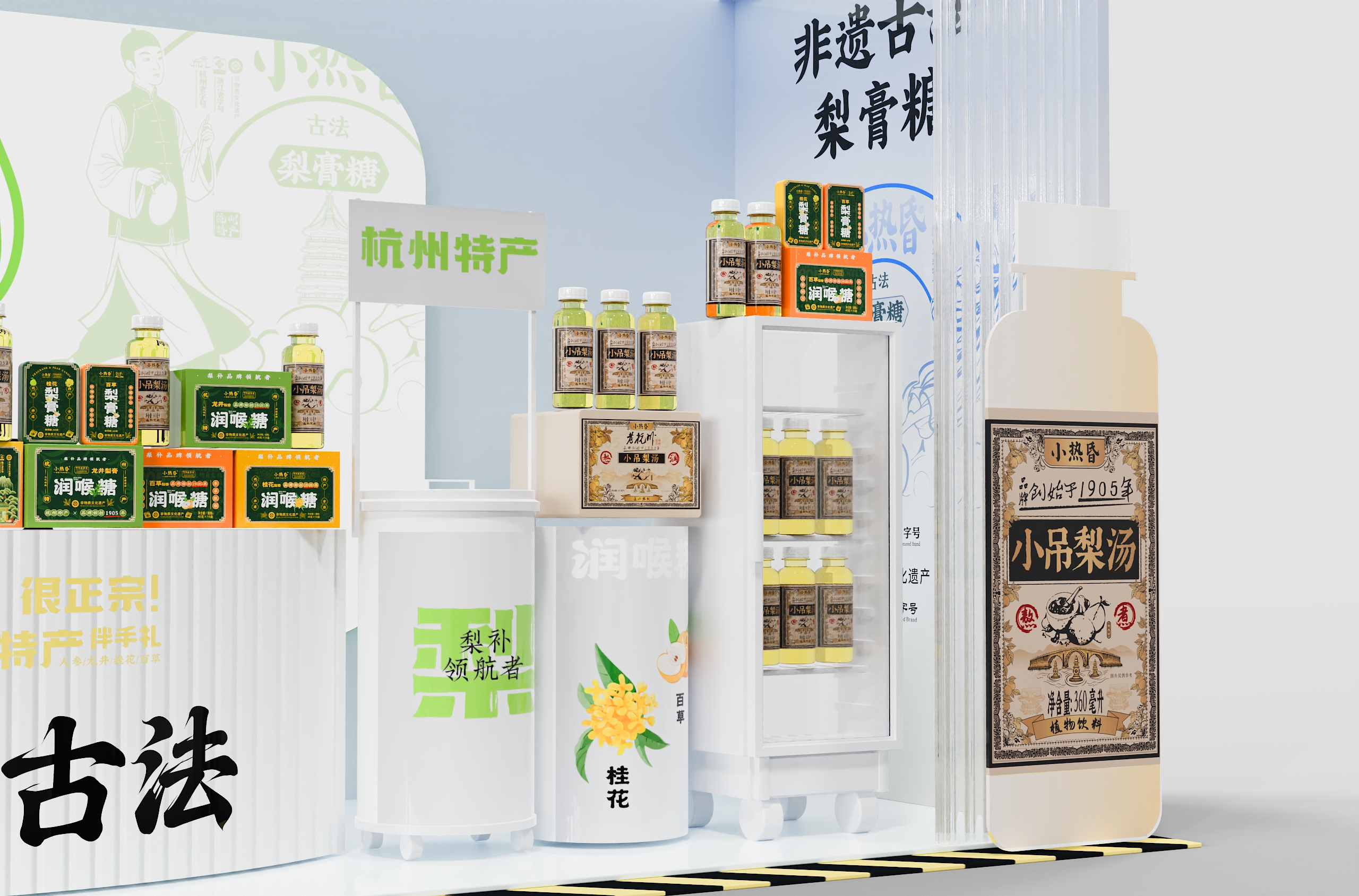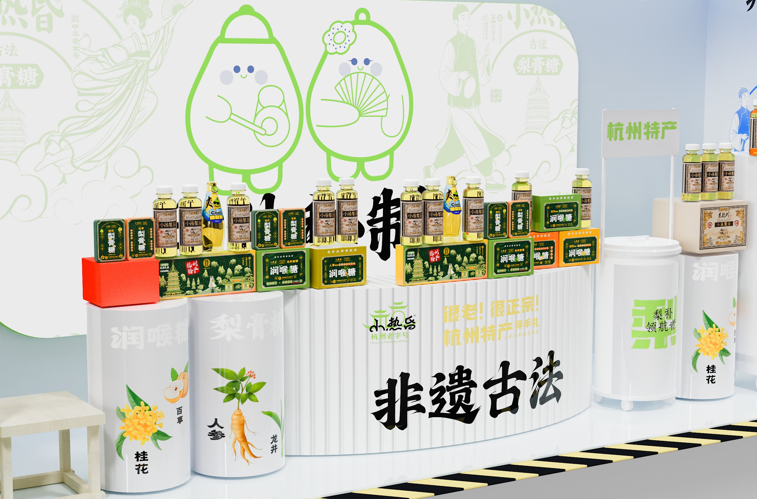 店内采用「回」字形动线设计,左侧小吊梨汤区模拟老式茶摊的温暖情境,右侧润喉糖展台借鉴中药铺的格栅美学。产品按风味系列纵向排列——龙井的翠绿、桂花的金橙、人参的赭红构成渐变色系,在纯白展台上演绎出视觉的味觉预告。特别设计的梯形展托,使每件商品均呈15度角面向顾客,实现「无需导购的自述式陈列」。