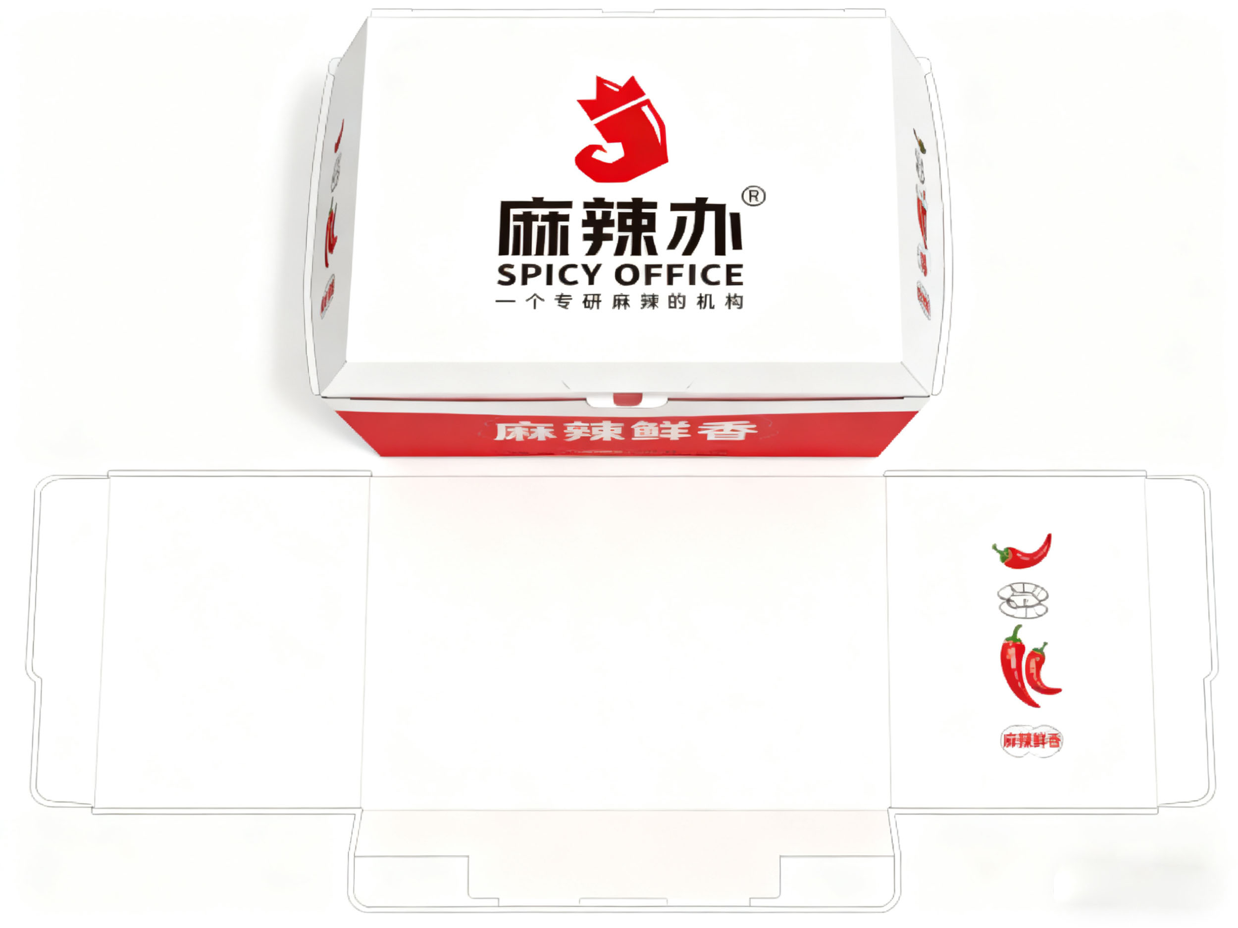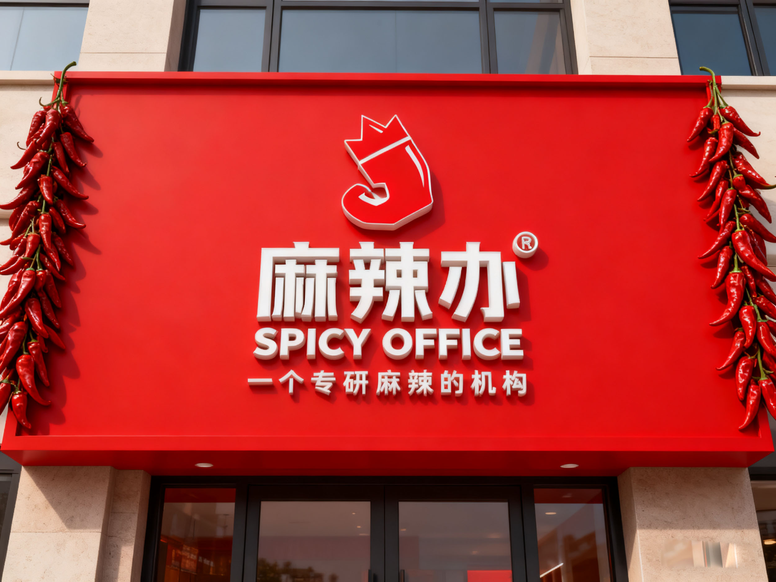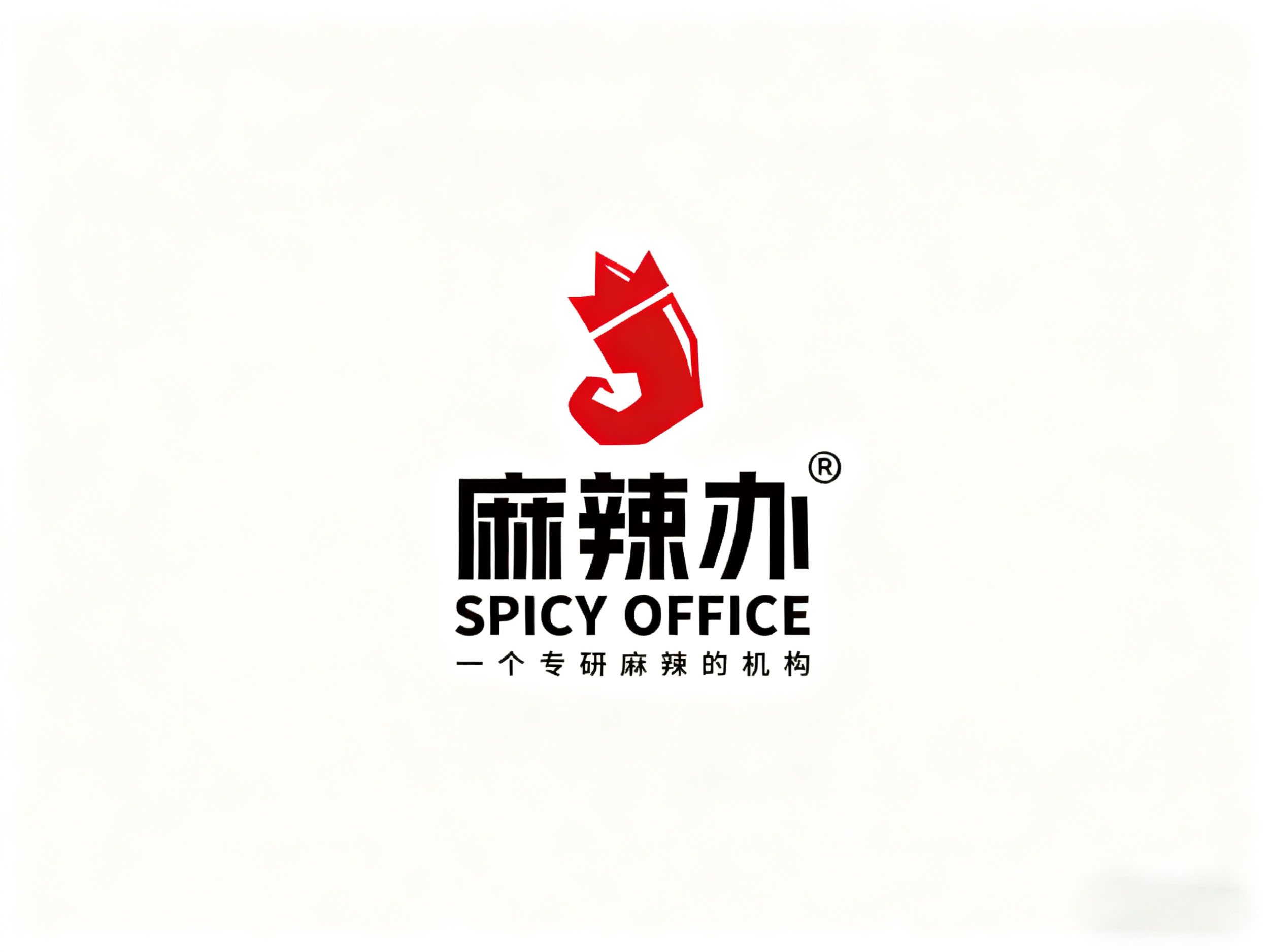 “麻辣办” 的黑色字体设计简洁大气,与红色图形形成强烈视觉对比,提升品牌名称的记忆点;下方的 “SPICY OFFICE” 英文标识与 “一个专研麻辣的机构” 标语,清晰传递出品牌的国际化视野与专业定位,让消费者直观感知到品牌在麻辣领域的专注与深度。整体版式层次分明,将品牌理念、品类属性与视觉符号高效整合,便于快速建立品牌认知。