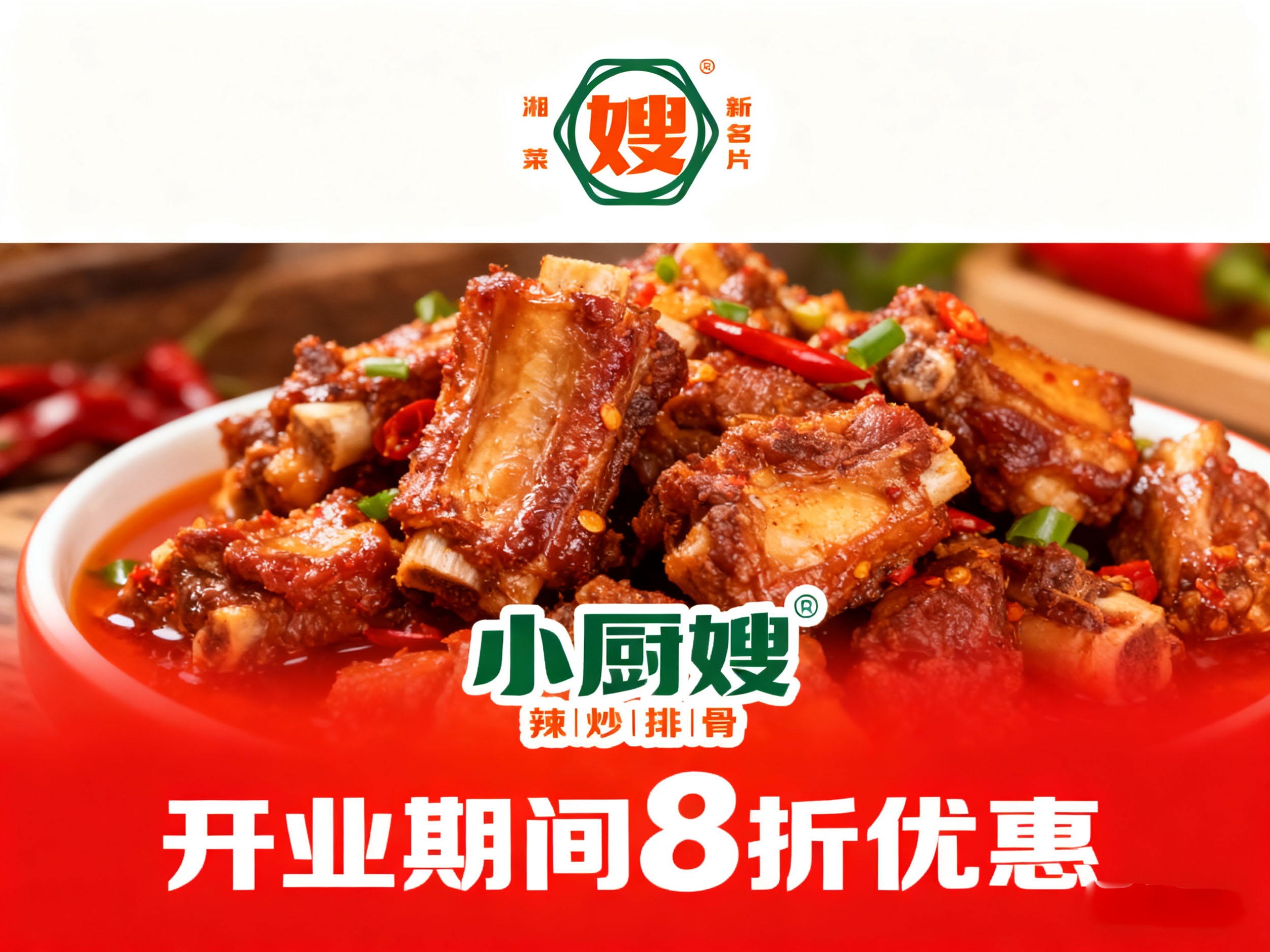 “湘菜 新名片” 的文字标识清晰界定品牌的地域属性与品质追求,让消费者直观感知到这是一个代表湘味新高度的餐饮品牌;“小厨嫂 辣炒排骨” 的分层文字,既强化品牌名称的记忆点,又明确核心菜品 “辣炒排骨”,精准传递出品牌的品类优势。整体版式层次分明,将地域文化、品类属性与品牌理念高效整合,便于快速建立品牌认知。