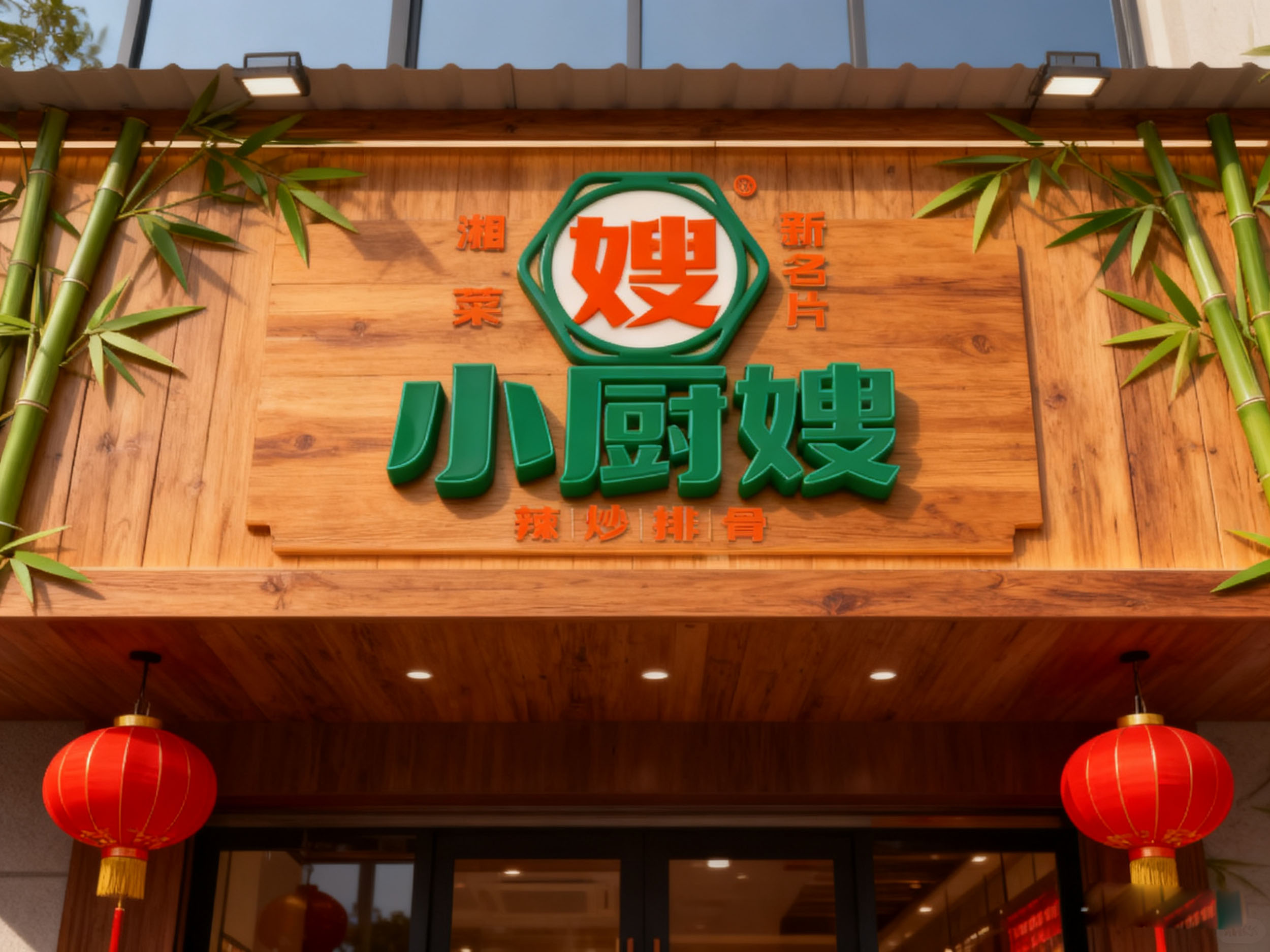 小厨嫂的 LOGO 以传统符号与湘味特质,构建出极具地域餐饮文化底蕴的视觉系统,深度诠释了品牌 “湘味新名片,厨嫂匠心菜” 的核心内涵。