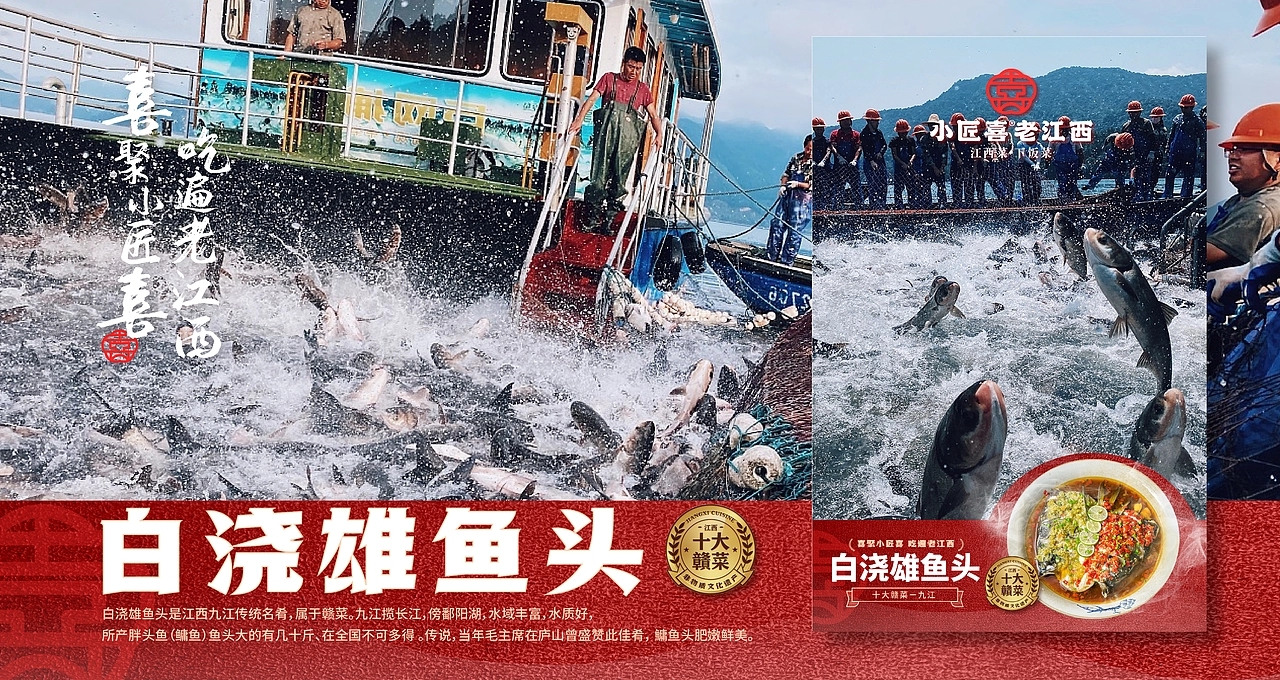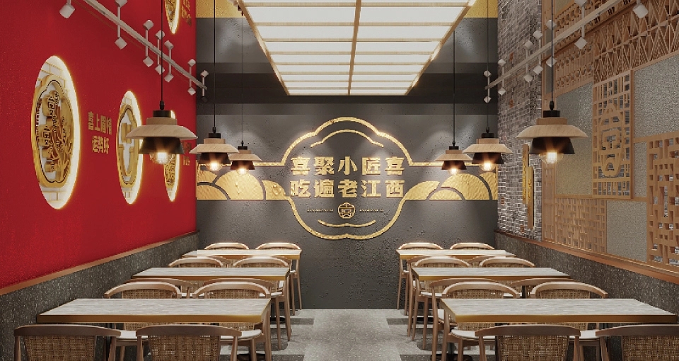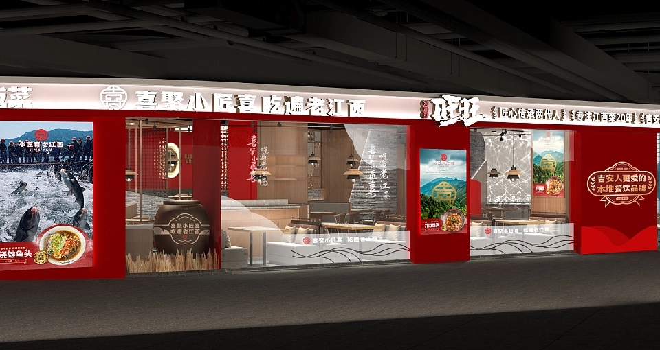 在品牌视觉架构上,小匠喜精准锚定三大核心方向:其一,深度融入赣文化与匠人精神元素,让每一处设计都承载江西的文化记忆与手作温度;其二,提炼江西地标建筑的独特形制与赣菜产品的经典呈现符号,将滕王阁的飞檐、赣江的波澜等元素化作视觉语言,让食客一眼便能感知江西韵味;其三,打造富有沉浸式体验感的空间场景,让用餐环境成为赣文化的延伸载体。