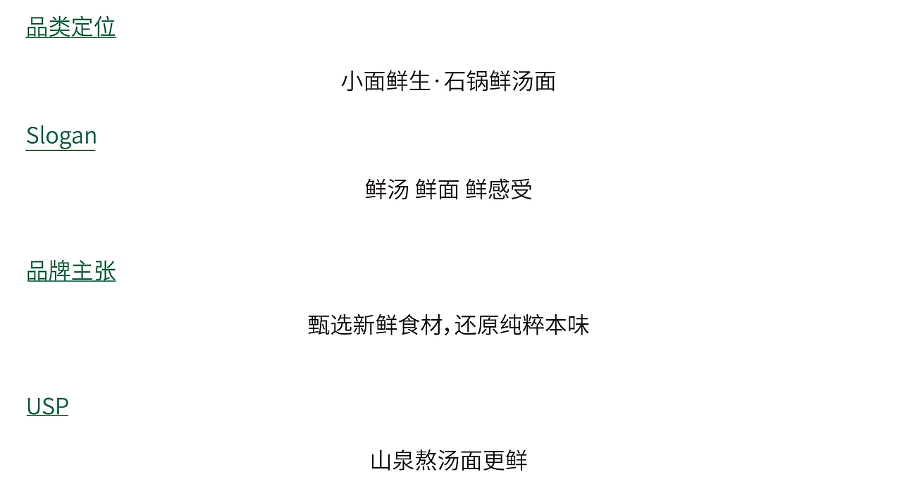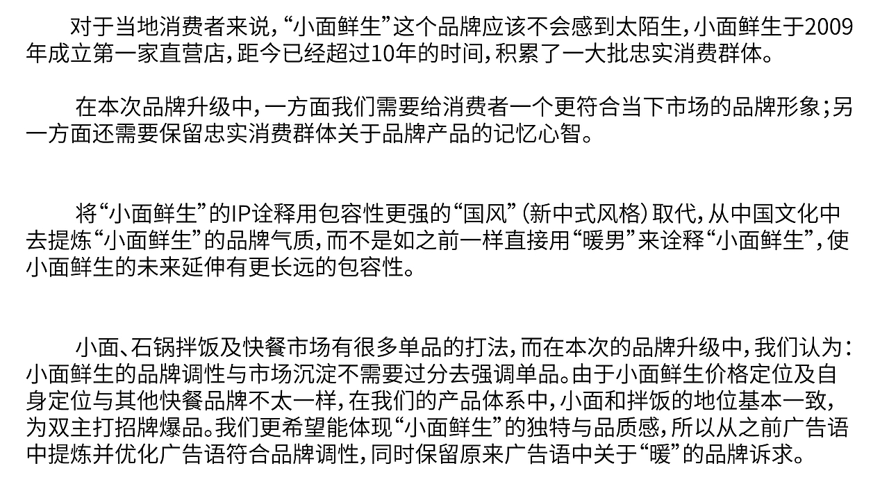 此外,在广告语的优化上,我们以保留品牌核心诉求为前提,从原有广告语中提炼关键元素并进行升级。“暖” 作为 “小面鲜生” 多年来传递的核心情感价值 —— 无论是食材的新鲜温度、餐食的暖心口感,还是服务的亲切态度,都是消费者对品牌的重要记忆点。因此,新广告语将继续延续 “暖” 的内核,同时结合新中式品牌形象与双主打产品策略,让语言表达更贴合升级后的品牌调性,既唤醒老顾客的情感共鸣,也能让新顾客快速感知 “小面鲜生” 的品牌魅力。