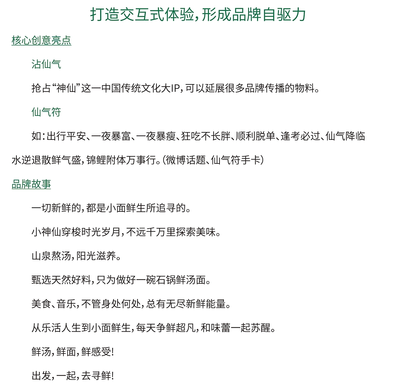 基于这一思路,我们对品牌 IP 进行了战略性调整 —— 将原本具象化的 “暖男” 诠释,升级为包容性更强的 “国风(新中式风格)” 定位。通过深入挖掘中国传统文化中的饮食文化、美学元素,提炼出与 “小面鲜生” 气质相符的文化符号,无论是产品包装、门店设计还是品牌传播,都将融入新中式的雅致与韵味。这一转变不仅能让品牌更具文化深度与差异化竞争力,更打破了 “暖男” IP 对品牌延伸的局限,为未来拓展产品线、探索多元消费场景提供了更广阔的空间。