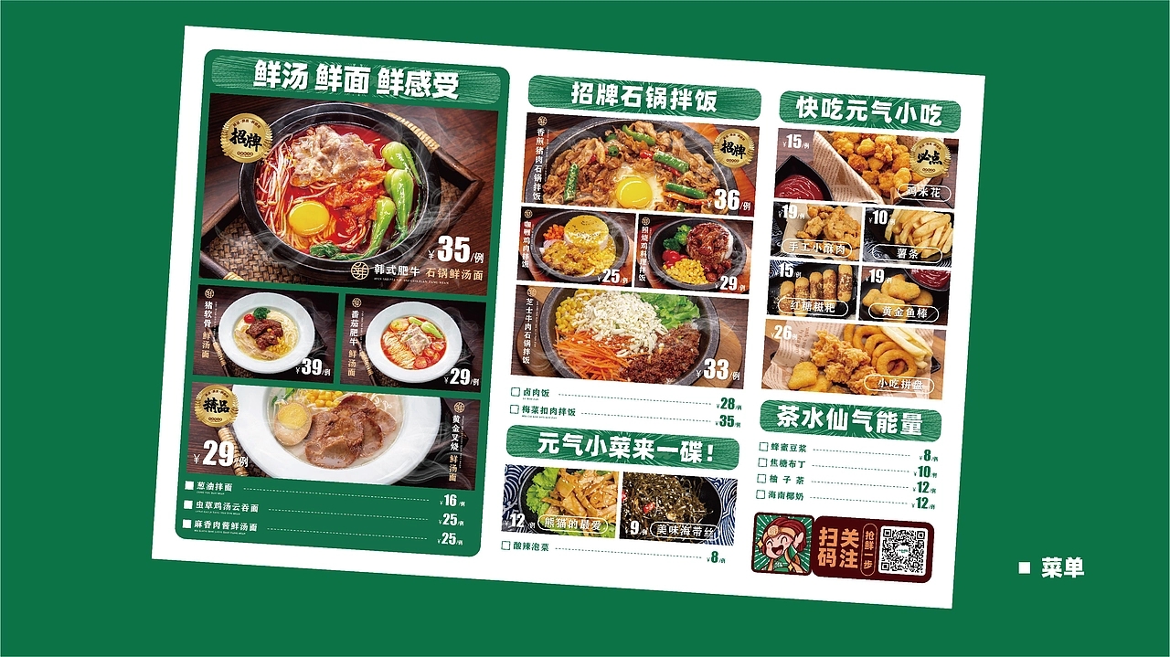 在产品策略上,我们并未追随当下快餐市场常见的 “单品爆款” 打法。结合 “小面鲜生” 的价格定位与品牌调性 —— 既区别于大众平价快餐,又致力于为消费者提供高性价比的品质餐食,我们明确了 “双主打招牌爆品” 的核心策略:小面与石锅拌饭地位平等,二者分别承载着消费者对传统风味与创新口感的需求,共同构成品牌的产品核心。这种定位既能凸显品牌在产品研发上的用心与实力,也能更好地满足不同消费群体的口味偏好,进一步强化 “小面鲜生” 的独特性与品质感。