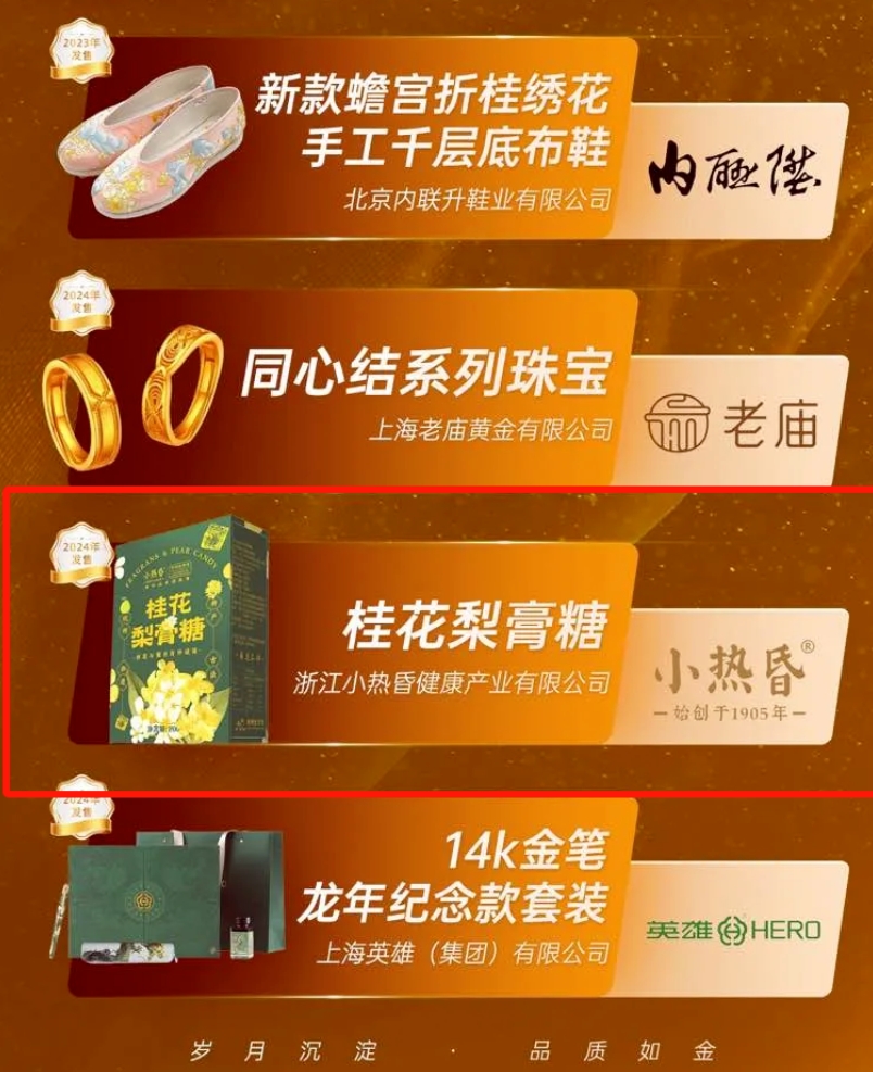 近日,由中国中小商业企业协会与商务部协同创新中心联合举办的2024老字号优选TOP10。在这场汇聚了众多老字号品牌的盛会上,小热昏桂花梨膏糖与蜂花氨基酸液体香皂、谢馥香红妆唇脂口红、北冰洋北冰制冰厂冰冰熊桔子酸奶风味发酵乳、方家铺子鱼胶原蛋白肽花巢饮口服液、宏济堂阿胶速溶粉、胡庆余堂石斛精华补水面膜、内联升新款宫折桂绣花手工千层底布鞋、老庙同心结系列珠宝、英雄14k金笔龙年纪念款套装等优秀产品,共同入选了2024老字号优选新品TOP10。