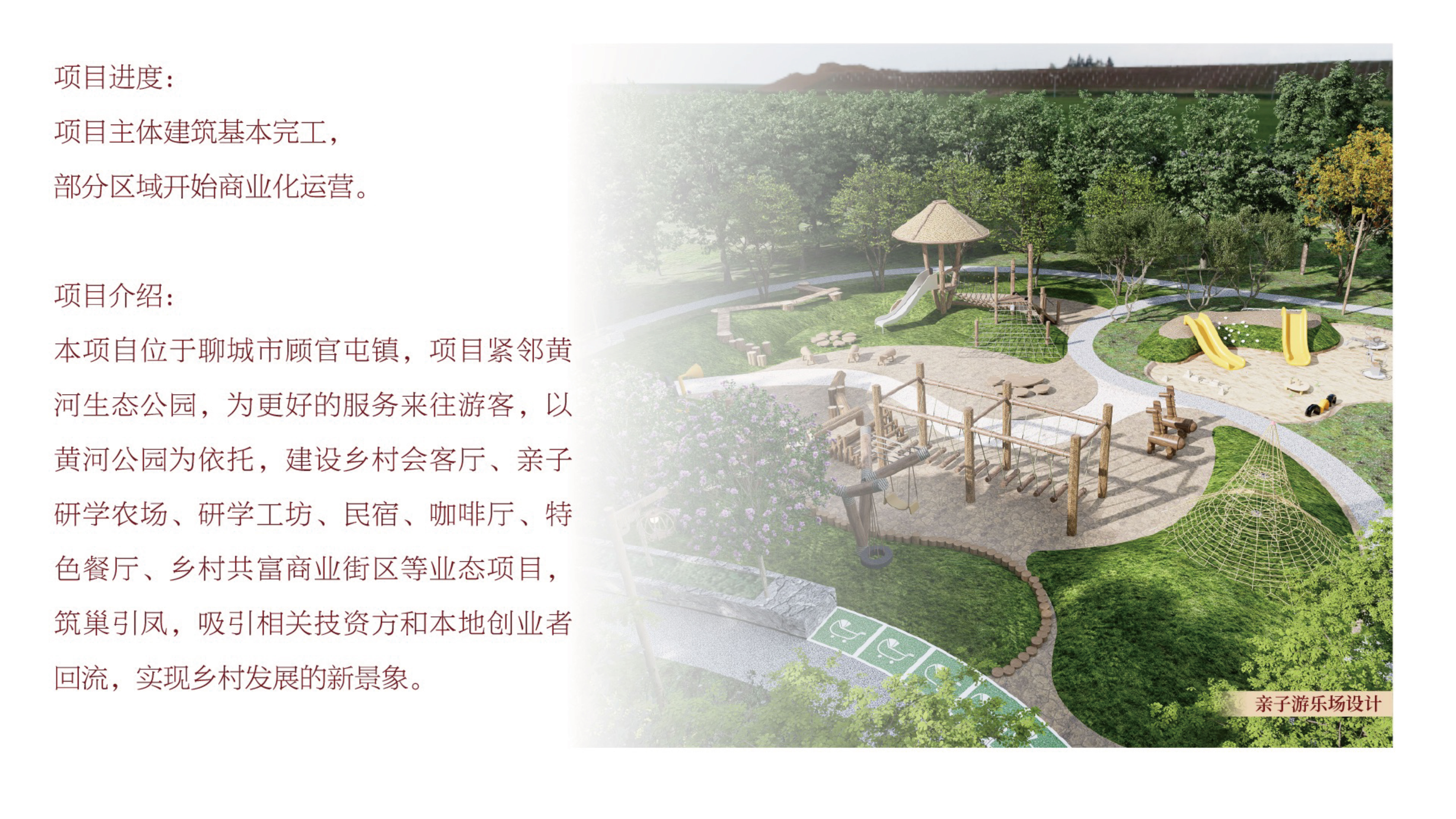 顾乡平野乡村振兴示范片区位于聊城市顾官屯镇,紧邻黄河生态公园,总规划面积约1200亩。项目以“生态赋能、产业驱动、文化再生”为核心理念,通过构建“一心一轴多组团”空间格局(以乡村会客厅为核心,黄河文化体验为轴线,多元业态协同发展),打造集生态观光、亲子研学、文创体验、休闲度假于一体的乡村振兴综合示范区。