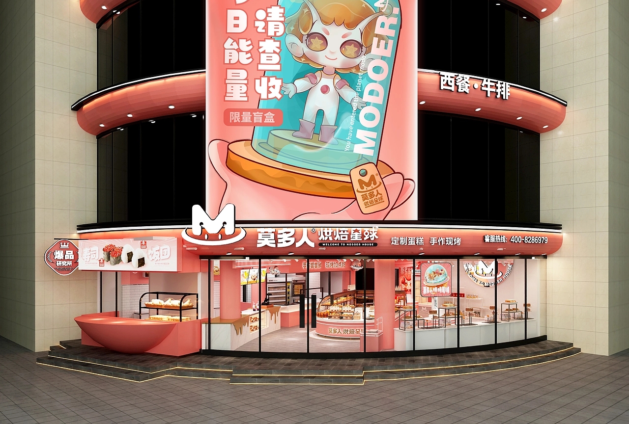 在空间效果打造上,莫多人烘焙星球突破传统烘焙店单一形态,构建 “烘焙 + 茶饮 + 超级爆品研究所 + 全透明烘焙长廊 + 新零售 + 沉浸式场景体验” 的复合型空间。其中,“全透明烘焙长廊” 让消费者直观看到食材处理、烘焙制作全过程,既传递出食材新鲜、工艺透明的信任信号,也增添消费趣味性;“超级爆品研究所” 聚焦爆款产品研发与展示,通过动态更新的爆品清单,持续吸引消费者关注;“烘焙 + 茶饮” 的组合满足消费者多元需求,而 “新零售” 板块则拓展消费场景,让品牌产品触达更广泛人群。整体空间以 “沉浸式场景体验” 为核心,从灯光氛围、动线设计到装饰细节,都融入生活美学元素,让消费者在进店瞬间便能感受到轻松、愉悦的消费氛围。
