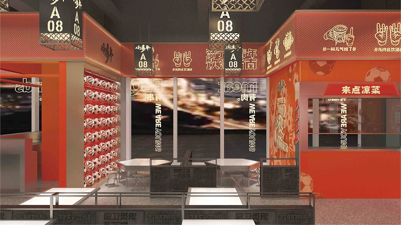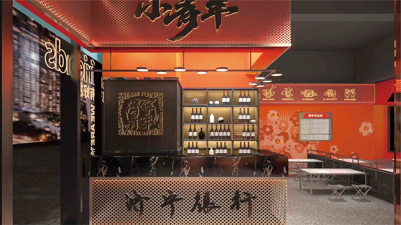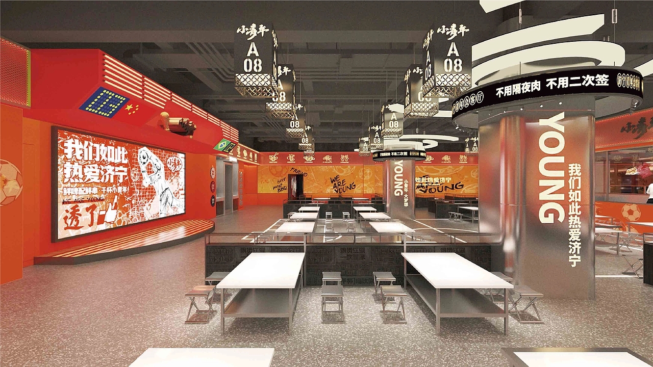 餐厅空间设计是品牌理念落地的关键,“小青年城市会客厅” 彻底打破传统餐厅 “餐台罗列” 的刻板布局,以 “社交场景优先” 为原则,打造富有故事感的独立会客空间。走进门店,看不到孤立的餐桌,取而代之的是围绕 “以串会友,以酒会友” 构建的多元社交模块:有适合三五好友围坐畅谈的 “热血卡座”,桌面嵌入可书写的涂鸦板,青年可随手记录灵感或心情;有适合多人派对的 “拼搏长桌区”,头顶悬挂着由青年运动装备、手写信件组成的装置艺术,传递 “并肩奋斗” 的氛围;还有半开放式的 “探索话题角”,墙面设置 “青年心愿墙”,消费者可贴上便签分享梦想,也可参与每周更新的主题讨论 —— 从 “职场新人如何快速成长” 到 “小众爱好如何坚持”,让社交不再局限于熟人圈子。空间细节更暗藏巧思:灯光采用可调节的暖黄色调,营造轻松氛围;背景音乐精选青春励志的流行曲与校园民谣,唤醒共同记忆;甚至服务员的工装也印着 “保持热爱,奔赴山海” 等青年向标语,让整个空间都成为 “青年意志的安放地”,在品尝烧烤的烟火气中,自然创造聚会、交流的机会,让 “青年会客” 的品牌概念深入人心。