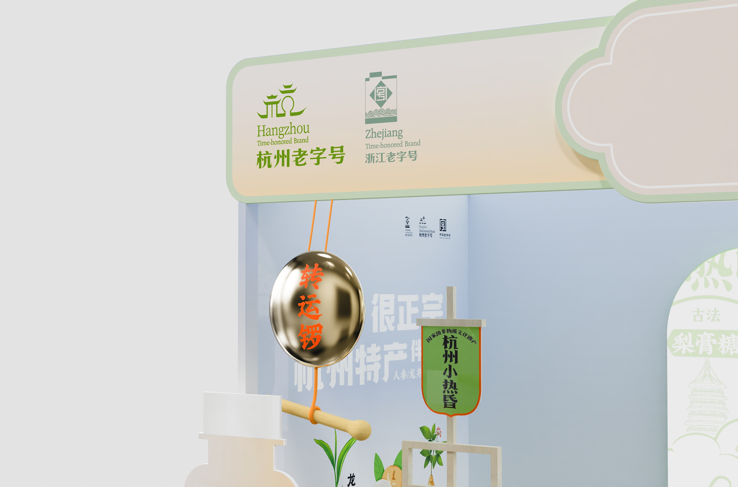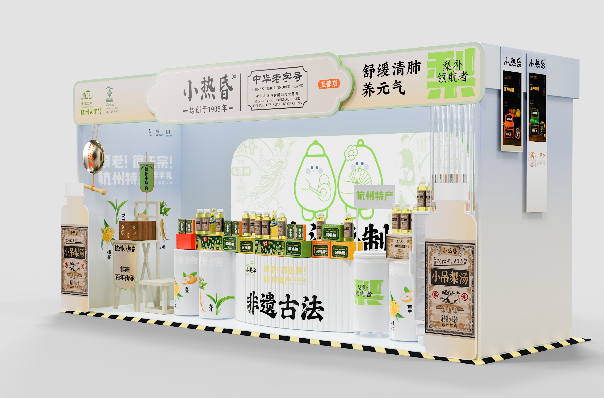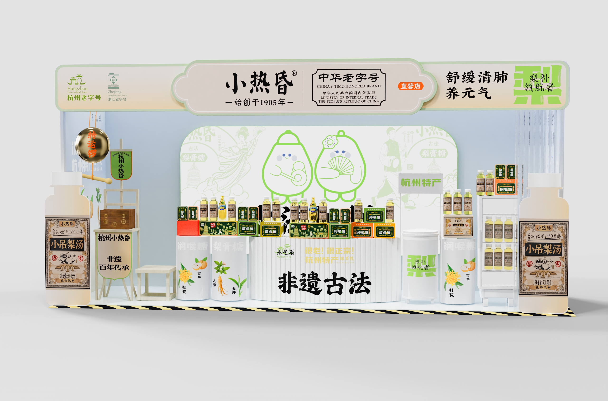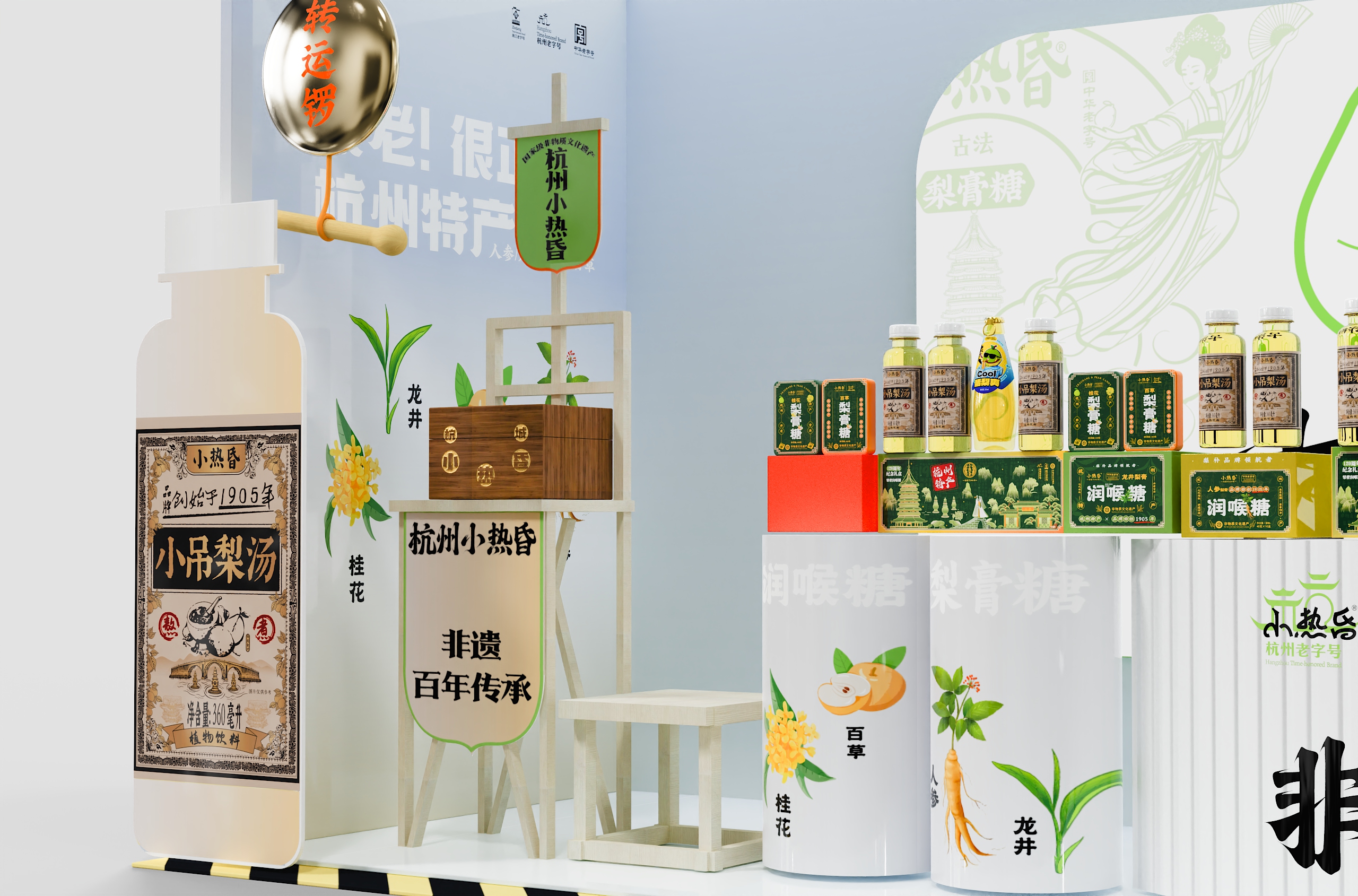 店内采用「回」字形动线设计,左侧小吊梨汤区模拟老式茶摊的温暖情境,右侧润喉糖展台借鉴中药铺的格栅美学。产品按风味系列纵向排列——龙井的翠绿、桂花的金橙、人参的赭红构成渐变色系,在纯白展台上演绎出视觉的味觉预告。特别设计的梯形展托,使每件商品均呈15度角面向顾客,实现「无需导购的自述式陈列」。