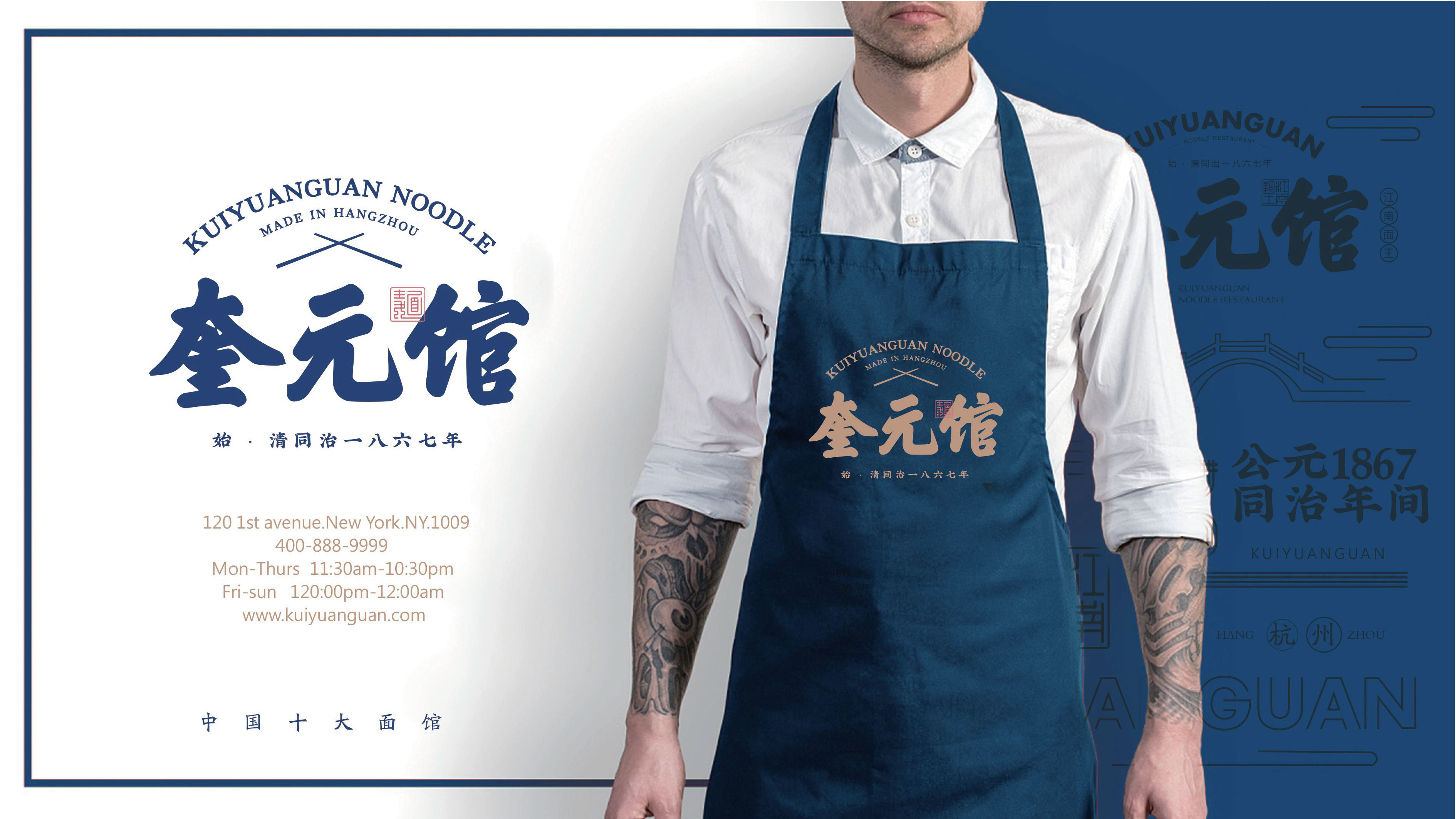 视觉体系独具匠心。书法字体特邀名家题写,行楷体兼具力道与流动感,“奎” 字撇捺如折扇、首笔藏面碗轮廓,“元” 字起笔似热气、末笔带竹筷意象,“馆” 字暗合碗盏、右下成汤勺形态,整体稳如石桌、动若汤滚。色彩上,主色深蓝源自江南靛青,象征百年坚守;点缀金色萃取汤头光泽,代表匠心珍味,黑白墨色构建高级灰度,显水墨留白意境。