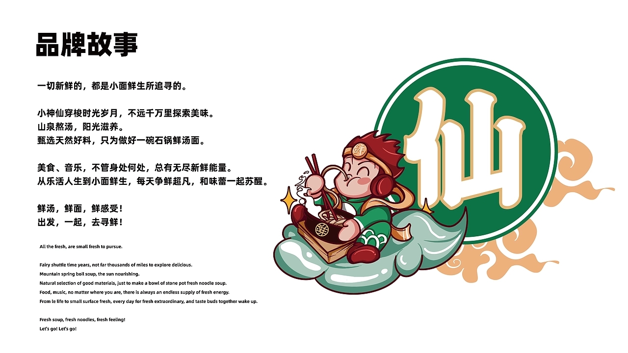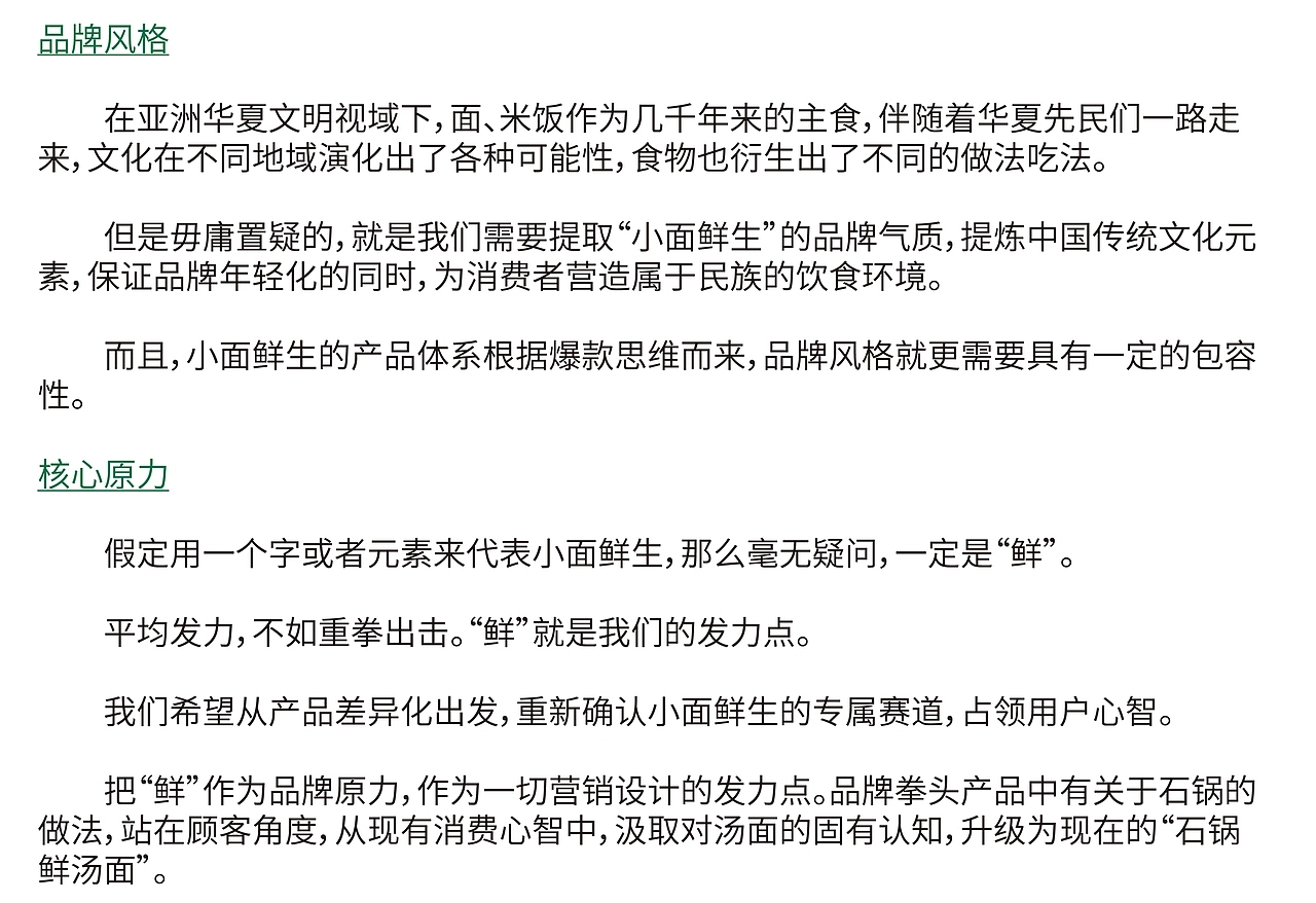 基于这一思路,我们对品牌 IP 进行了战略性调整 —— 将原本具象化的 “暖男” 诠释,升级为包容性更强的 “国风(新中式风格)” 定位。通过深入挖掘中国传统文化中的饮食文化、美学元素,提炼出与 “小面鲜生” 气质相符的文化符号,无论是产品包装、门店设计还是品牌传播,都将融入新中式的雅致与韵味。这一转变不仅能让品牌更具文化深度与差异化竞争力,更打破了 “暖男” IP 对品牌延伸的局限,为未来拓展产品线、探索多元消费场景提供了更广阔的空间。