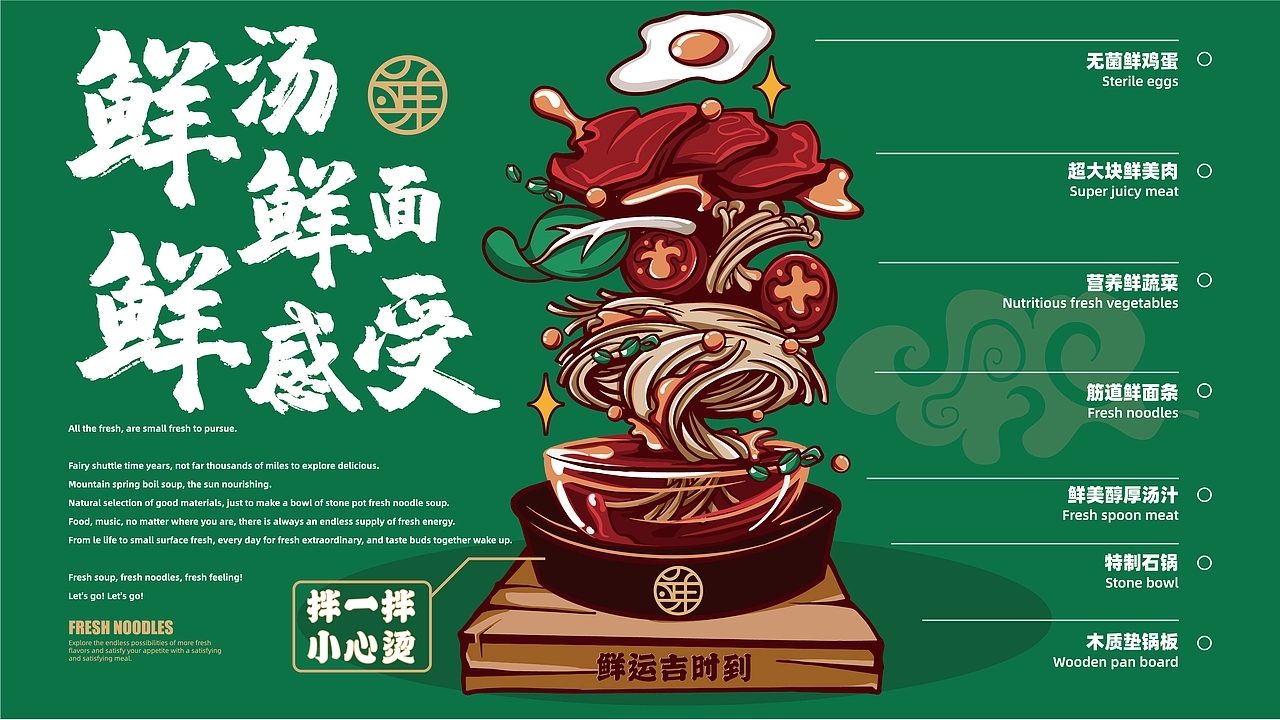 此外,在广告语的优化上,我们以保留品牌核心诉求为前提,从原有广告语中提炼关键元素并进行升级。“暖” 作为 “小面鲜生” 多年来传递的核心情感价值 —— 无论是食材的新鲜温度、餐食的暖心口感,还是服务的亲切态度,都是消费者对品牌的重要记忆点。因此,新广告语将继续延续 “暖” 的内核,同时结合新中式品牌形象与双主打产品策略,让语言表达更贴合升级后的品牌调性,既唤醒老顾客的情感共鸣,也能让新顾客快速感知 “小面鲜生” 的品牌魅力。